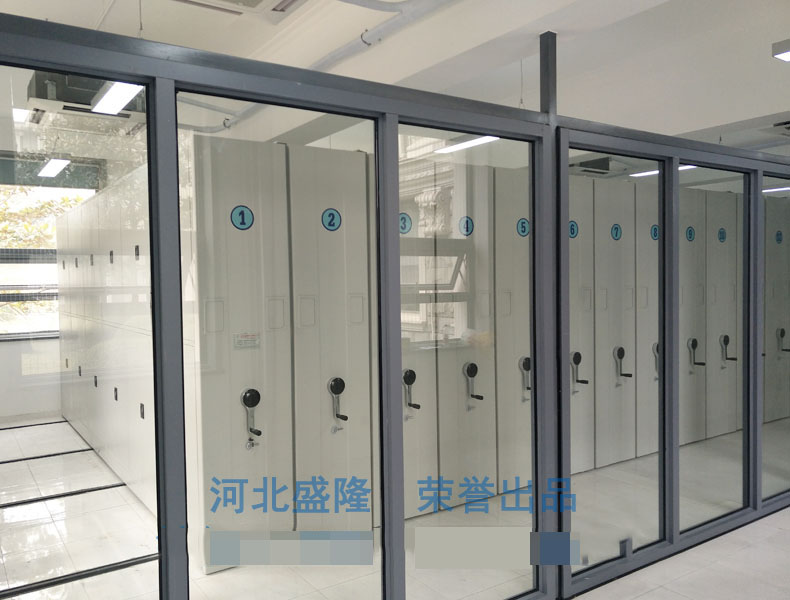 4、密集柜各列之間裝有磁性吸力橡膠密封條裝置,該密封條經防老化處理。在架體頂部裝有防塵板,底部裝有防鼠、防光的要求。